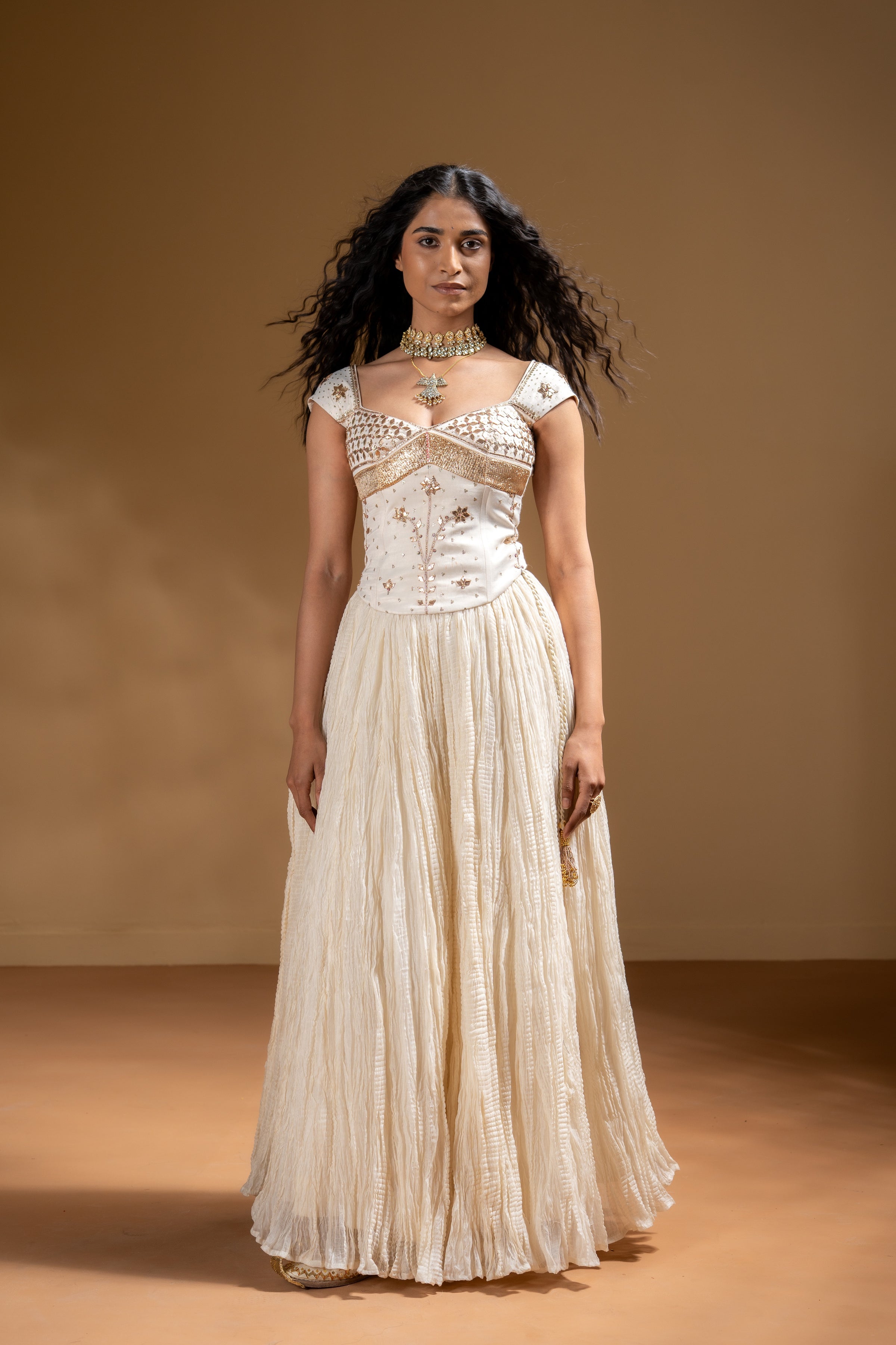 A two-piece set featuring a wrinkled white Chanderi skirt with pocket that adds texture and fluid movement. Paired with a Off-white corset top in muslin highlighted with full gota work, the ensemble balances structure and softness, offering a modern yet festive silhouette ideal for celebratory occasions.